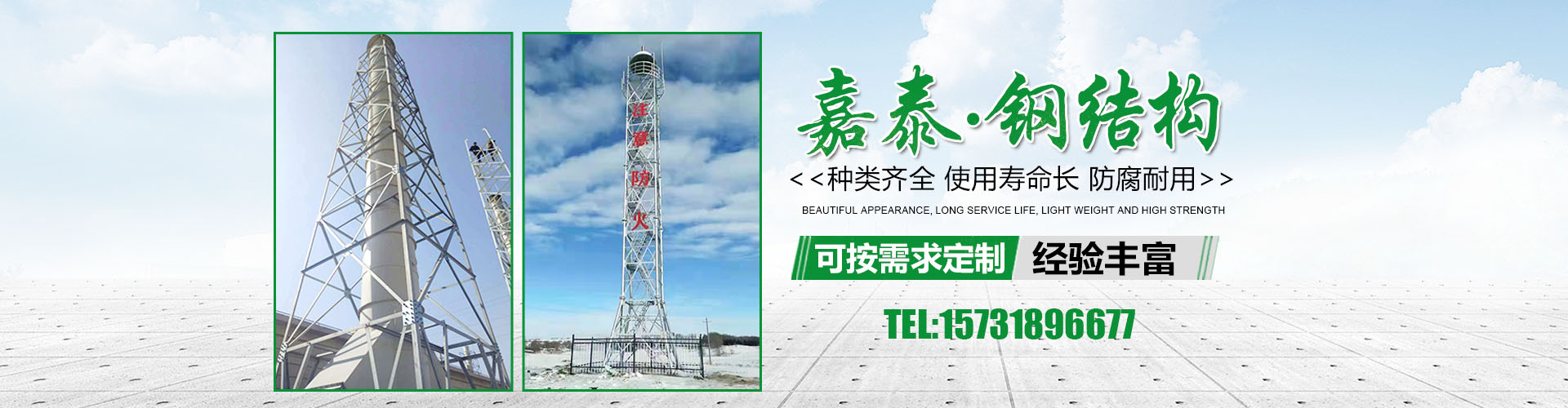 衡水嘉泰鋼結構有限公司位于鐵塔制造之鄉-衡水市景縣廣川經濟開發區,石德、京九鐵路交匯處,距北京、天津、石家莊、濟南均在2小 時交通圈內,交通便利。公司主要產品有:避雷塔、監控塔、瞭望塔、消防訓練塔、電力架構、樓頂工藝塔、廣播電視塔、煙囪塔、測風塔 、電力塔、單管塔、雷達塔、仿生樹塔、氣象觀測塔、路燈桿,一體化基站、ETC龍門架等,是一家集設計,生產,運輸,安裝,維護為一體的廠家。主要服務于鐵塔公司、通信三大運營商、國防通訊,鐵路及森 ......